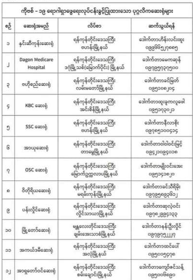 COVID-19 ရောဂါရှာဖွေရေးလုပ်ငန်းခွင့်ပြုထားသော ပုဂ္ဂလိကဆေးရုံ ၁၂ ခု