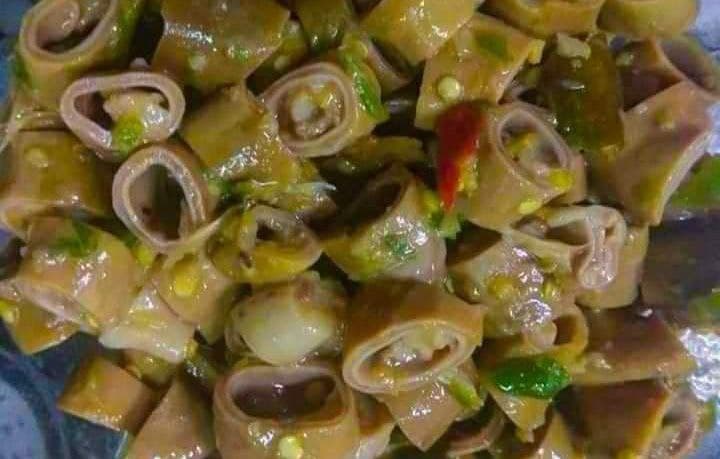 ငရုပ်သီးစိမ်းကို ညှပ်နေအောင်ထောင်းပါ ပြိးရင် ကြက်သွန်ဖြူပါ ထည့်ထောင်းပါ ညှပ်ရင် ငါးပိစိမ်းစားအစစ်ကို ရောထောင်းပါ အားလုံးအစဉ်သင့်ပြိးတာနဲ့ ပုဂံထဲကို ဝက်အူ ညှပ်ထား ပြိးရင် ထောင်းပြိးသားအစပ်ကိုရောသမ ပြိးတာနဲ့ သံပုရာသိးအရည်ညှစ် ပြိးရင် ဆား အချို အသင့်တင့်ထည့်ပြိး စားသုံးနိုင်ပါပြ်