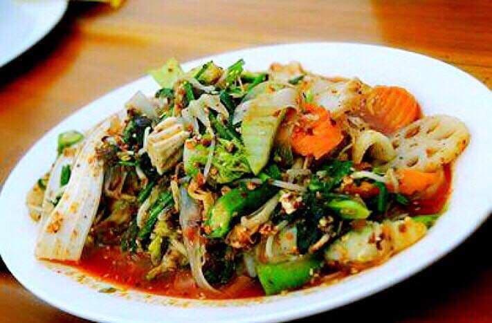 ၆။ ပြီးနောက် ကန်စွန်းရွက်၊ မုန့်ညှင်းစိမ်း၊ ခေါက်ဆွဲ၊ မြေပဲထောင်း တိုကို ထည့်ပြီး သမအောင် ရောမွှေလိုက်ပါ။