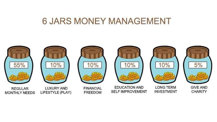 ယခုဖော်ပြမယ့်နည်းစနစ်ဟာ ရိုးရှင်းလှပါတယ်။ဖန်ဘူး ၆ခုရှိတယ်လို့စိတ်ကူးကြည့်ပါ။ဖန်ဘူးတစ်ခုချင်းစီဟာ ငွေကို ဘယ်နေရာမှာ ဘယ်လောက်ပမာဏအသုံးပြုရမလဲဆိုတာကို ကိုယ်စားပြုပါတယ်။အဲ့ဒါကိုနားလည်လွယ်စေဖို့အတွက် ခေါင်းစဉ် ၆ခုနဲ့တစ်ခုချင်းရှင်းပြသွားပါ့မယ်။