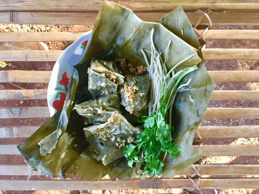 - ရေဆေးထားတဲ့ ငှက်ပျောရွက်ကို လှီးဖြတ်၊ နယ်ထားတဲ့အစာတွေထည့်ပြီး ထုပ်ပါ။