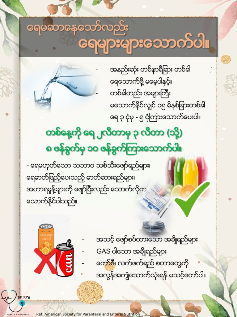 ကျွန်တော်တို့ ခန္ဓာကိုယ်ဟာ ရေဓာတ် ၇၀ ရာခိုင်နှုန်းနဲ့ ဖွဲ့စည်းထားတာပါ။ ခန္ဓာကိုယ်မှာ ဖျားတဲ့အခါ၊ ချောင်းဆိုး အသက်ရှုမြန်တဲ့အခါ ရေဓာတ်က အလျင်အမြန်ဆုံးရှုံးပါတယ်။ ပျို့အန် ဝမ်းလျှောတဲ့အခါ ပိုလို့တောင် ဆုံးရှုံးပါသေးတယ်။ ရေဓာတ်ခမ်းခြောက်လာလျှင် သွေးပေါင်ချိန်ကျလာခြင်း၊ ဆီးနည်းလာခြင်း၊ နောက်ဆုံးကျောက်ကပ်ထိသည်အထိဖြစ်တတ်လို့ နေမကောင်းဖြစ်နေစဉ်မှာ ရေဓာတ်အပြည့် ဖြည့်နေဖို့လိုပါတယ်။