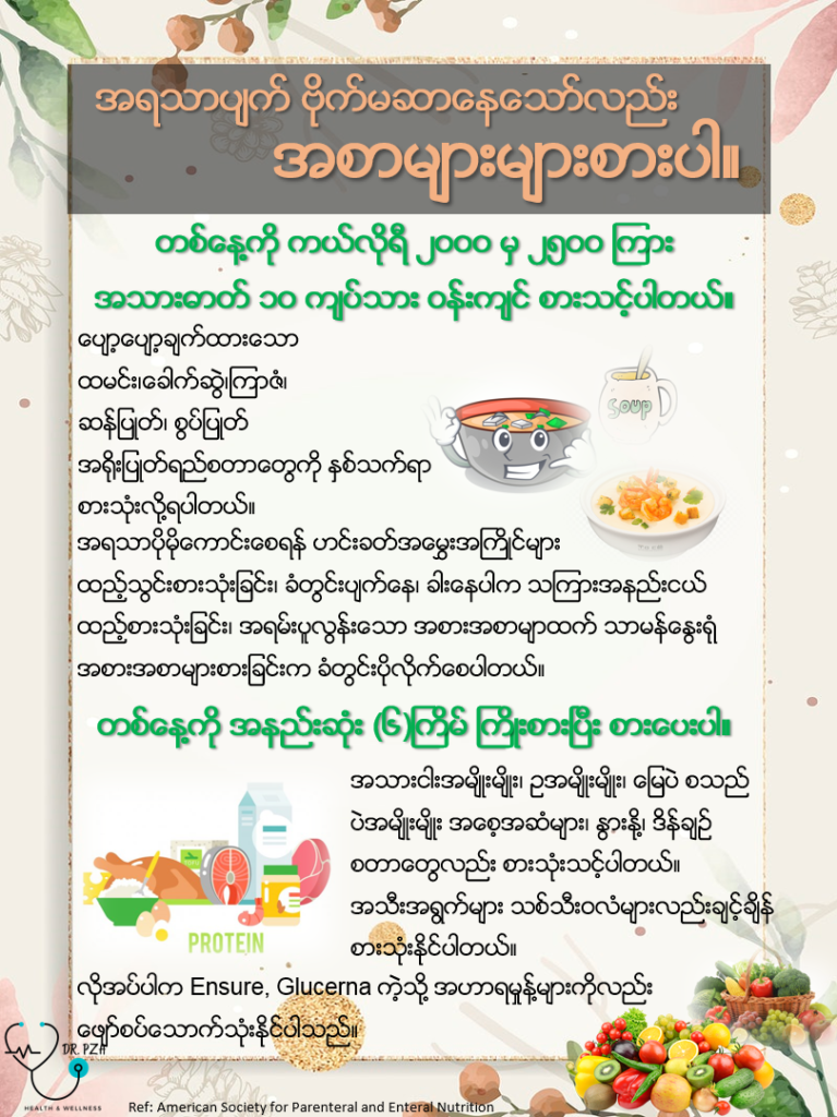 နေမကောင်းဖြစ်တဲ့အခါ ခံတွင်းပျက် အရသာပျက်တော့ စားချင်စိတ်မရှိသည်မှာ မှန်သော်လည်း တတ်နိုင်သမျှ ကြိတ်မှိတ်ပြီး အစာဝင်အောင် စားသုံးပေးရပါမယ်။