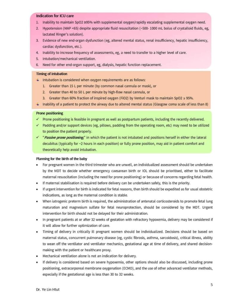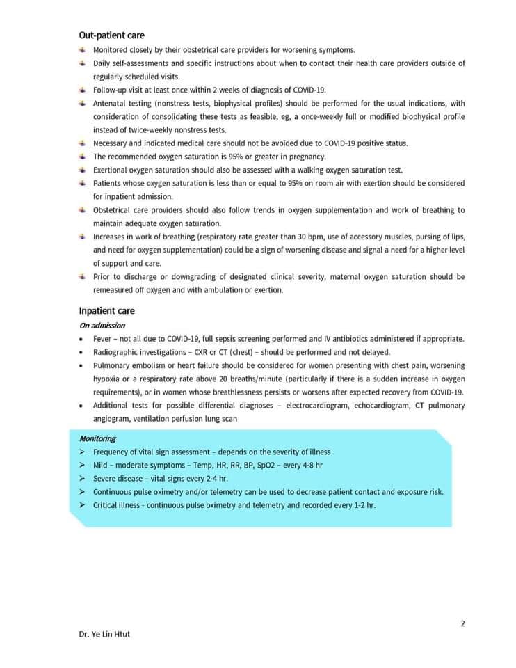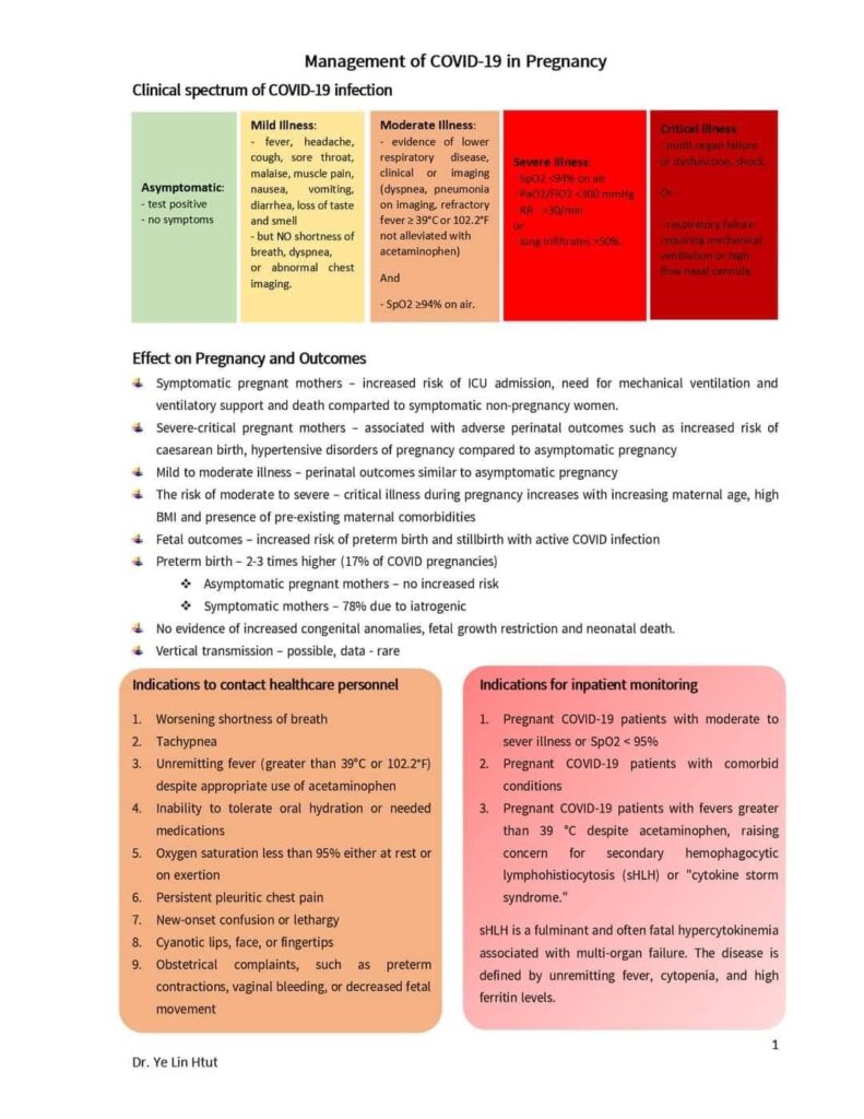 Covid-19 in pregnancy လို့​ပြောရင် management of pregnancy in COVID-19 pandemic နဲ့ management of COVID-19 in pregnancy ဆိုပြီး ၂ ပိုင်းရှိပါတယ်။ အခုဖြစ်ပွား​နေတဲ့ အ​ခြေအ​နေအရ pregnancy မှာ COVID-19 ဖြစ်လာရင် ဘယ်လိုကုရမလဲ ဆိုတဲ့အပိုင်းကိုပဲ ​ဝေမျှ​ပေးသွားမှာဖြစ်ပါတယ်။
