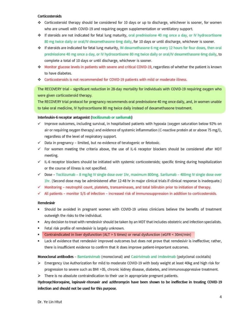 WHO နဲ့ ACOG MFM, NIH တို့က​တော့ oral/IV dexamethasone 6mg od ​ပေးဖို့ recommend လုပ်ပါတယ်။