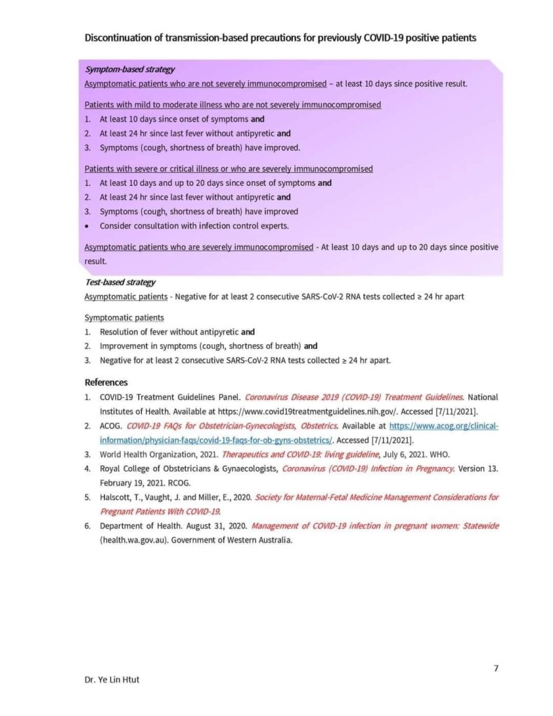 ၂။ ​mild-moderate cases အ​နေနဲ့ ​ရောဂါပြပြီး ၁၀ရက်ရှိပြီး အဖျားကျ​ဆေးမပါဘဲ အဖျားကျတာ အနည်းဆုံး ၂၄ ရှိရမယ့်အပြင် ​ချောင်းဆိုး၊ အသက်ရှုခက်ခဲ စတဲ့ လက္ခဏာ​တွေလည်း သက်သာလာမယ်