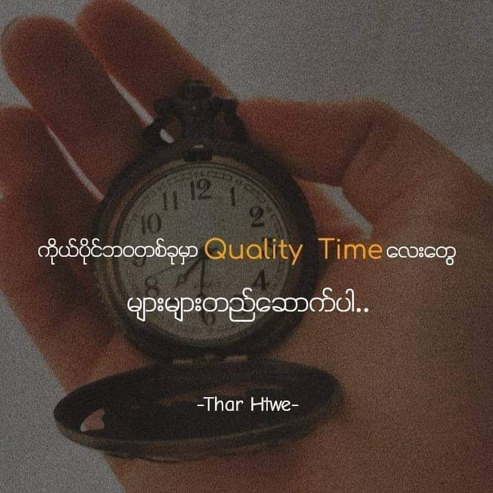 ကိုယ်နှစ်သက်သဘောကျတဲ့လူ…ကိုယ်မြတ်နိုးတဲ့ တန်ဖိုးကြီးအရာတွေကို ပိုင်ဆိုင်ရတာလဲ မဟုတ်ဘူး….။Quality time အစစ်မှန်ဆိုတာက… ကိုယ့်စိတ်ရဲ့လွတ်လပ်ရာ ကိုရှာတွေ့သွားတဲ့အချိန်မျိုး….။အချစ်တွေနဲ့ပူလောင်စရာမလိုတော့တဲ့အခါ….ဘယ်သူ့ကိုမှ မနာလိုမုန်းတီးစရာ မရှိတဲ့အချိန်….ကိုယ့်ရဲ့စိတ်ပေါ်မှာ ချစ်ခြင်း မုန်းခြင်းတွေနဲ့ ကင်းလွတ်တဲ့အခါကို…. Quality Time လို့ခေါ်ပါတယ်….။
